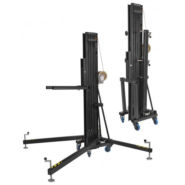 VMB TL-056B 6.5m/200kg ILS Black TL-056Max. height 6.5m (21.3′) Lifter made with structural steel base and 6082-T6 aluminum alloy for the sections. Designed to lift heavy loads from the ground, and keep them at high altitudes. This lifting tower is very compact and easy to handle, it has 4 swivel castors on the base and can fit through a door. Powerful stabilizers in the legs, to level the lifter in difficult terrains, with slight slope. Black finish, with epoxy powder paint offering great resistance. It has two adjustable steel load forks that support the load, either supported on top of it, or hung underneath. VMB offers you a wide range of accessories, which combined with this lifter allows you to increase the number of applications. One of the most used accessories, for example, is the RH-2 transport kit, which serves to tilt the lifter, horizontally and make the transportation in vans, trucks, etc. easier. The TL-056 features the inertial pendulum ILS safety system. It also has the special SRS Retentor system, patented by VMB, which guarantees that the towerlift’s aluminum sections will rise in order, and most importantly: automatically. VMB offers you a 2-year warranty and stock of spare parts for 5 years. In addition we have our own factory in Spain, where we offer service to review and repair your lifter.