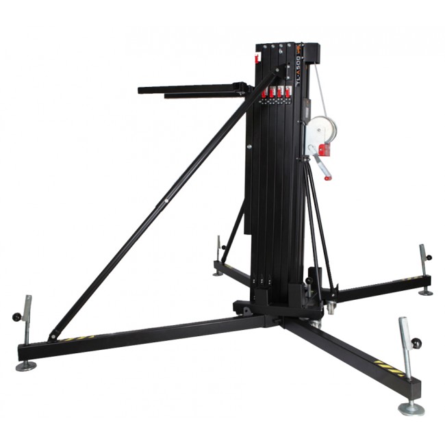 VMB TL-A500 7m/500kg LINE ARRAY LIFT (BLACK) TL-A500Max. height 7m (22.96′) The TL-A500 towerlift has been designed for lifting line array audio systems from the ground and keep them fix at high altitude. It has 2 special aluminum straps fixed from the legs to the aluminum base section to reinforced the body of the lifter. This lifting tower is very compact and easy to handle, it has 4 swivel wheels at the base. It fits through a door. It has powerful stabilizers in the legs, to level the lifter in difficult terrains, with slight slope. Black finish, with epoxy powder paint to the oven, which offers great resistance (The towerlift can be painted in the desired color, under prior request). It has two adjustable steel load forks that support the load, either supported on top of it, or hung underneath. VMB offers you a wide range of accessories, which combined with this lifter allows you to increase its unlimited number of applications. One of the most used accessories, for example, is the FAS-01, which is used to hang Line Array audio systems in a fast and effortless way. The TL-A500 features the ALS Red locks of VMB, which automatically blocks each section while lifting. And the inertial pendulum ILS safety system for the aluminum lifting carriage. It also has the special SRS Retentor system, patented by VMB, which guarantees that the towerlift will raise the aluminum sections orderly and automatically. VMB offers you a 2-year warranty and stock of spare parts for 5 years. In addition we have our own factory in Spain, where we offer service to review and repair your lifter.