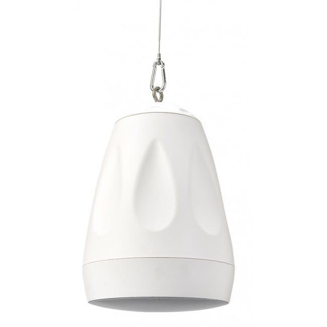 of suspension components is included with each loudspeaker. Horizontal dispersion is 360°. They include a 25/70/100 V-line transformer with five power tapping's, plus the option for low-impedance operation (8 ohms). The power setting is selected by a rotary switch on the upper surface of the enclosure. Each loudspeaker is supplied with a separate top cover which protects the connections and power selector switch from dust and debris after installation. The bottom face of the enclosure is sealed by an aluminium grille.