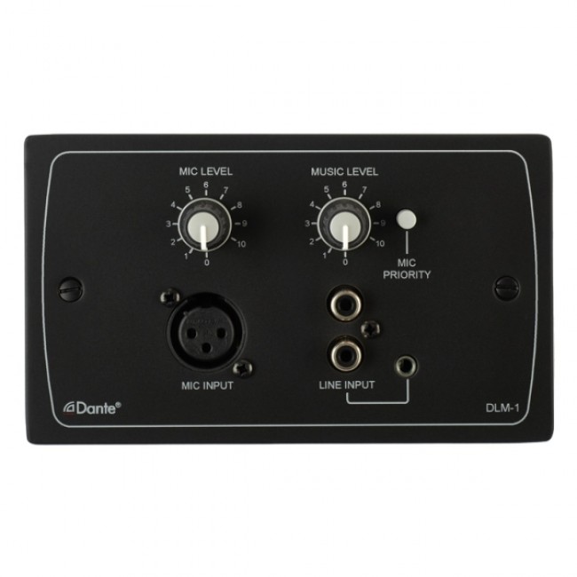 The DLM-1 Series is a range of remote mic/line input modules for use in a Dante-compatible network audio system. A DLM-1 module allows a microphone and/or a stereo music (or other line level) source to be connected at a remote location. The music input is mixed with the mic signal and the resulting output appears as a mono Dante channel at a standard RJ45 Ethernet port. Typically, the Dante channel will then be routed via the Dante network to the audio system (a Dante-equipped amplifier or mixer) feeding the speakers in the area where the module is fitted. Selectable mic-over-music priority is provided.