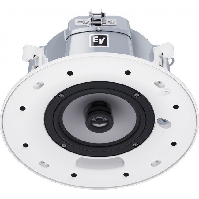 The Electro-Voice EVID-EC6.2E is a complete 6.5-inch coaxial two-way loudspeaker that offers excellent sound quality and outstanding reliability with first-class aesthetics. The EVID-EC6.2E utilizes a transformer that offers a selection of 1.88 (70-V only), 3.75, 7.5, 15 or 30 watts delivered to the loudspeaker system using either 70-V or 100-V lines, or 8-ohm bypass. Selection is via a convenient switch on the front baffle. The perforated grille is finished in semi-gloss white powder-coated enamel. The baffle is constructed from UL 94V-0 rated ABS. The rear enclosure is constructed from heavy gauge coated steel. The low-profile enclosure makes it easy to mount in very tight spaces. A side terminal-cover provides access to a 4-pin terminal block that allows direct connection to the speaker with 12-gauge and 3.3 mm2-wire and provides pass through to additional speakers.