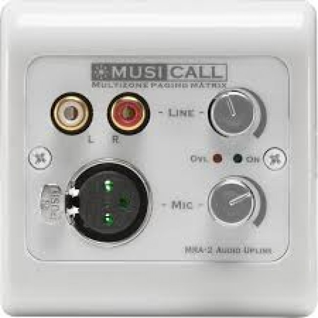 Dual mono audio input for Mic and Line signals, with mixing controls. Color white. Connection by shielded cable