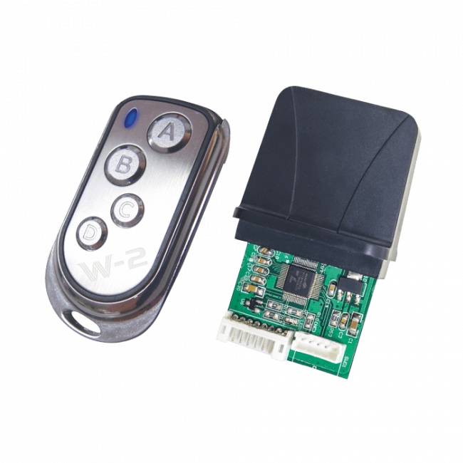 This optional remote control kit consists of two parts: the W-2 transmitter (or remote control) and the ES-W2 receiver which is compatible with the Antari F-6, F-7, F-7X and the M-12. The receiver is connected via two sockets. The WTR-110 uses the free 433 MHz band and has a maximum range of 50 metres, depending on local conditions. Functions are on/off and volume up/down.