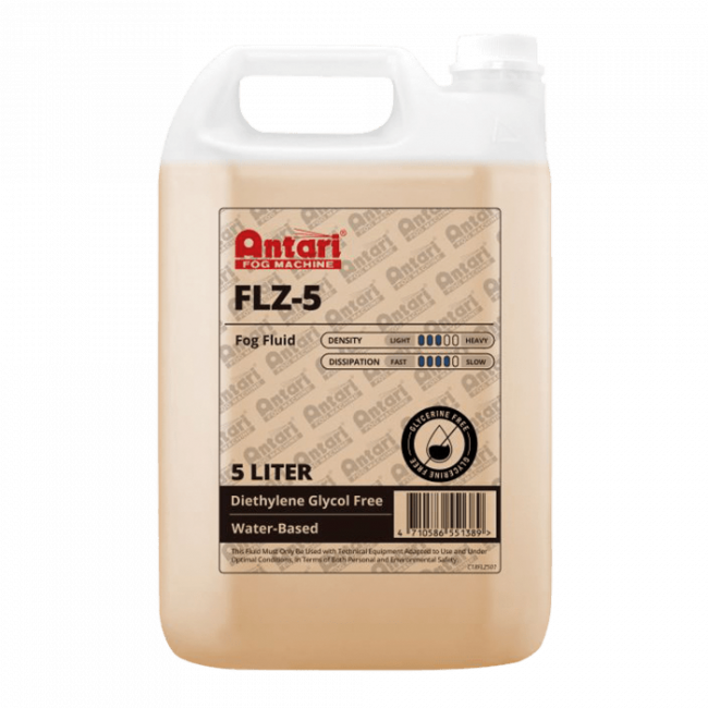 The Antari FLZ-5 Fog Fluid is a water-based fog fluid that produces a medium-density fog that is dissipating quite slowly. It can be used as a replacement for the Antari FLY fog fluid. It is slightly less dense and therefore less likely to clog the heater. All ingredients used in Antari fluids are harmless and not classified under the CLP regulations.