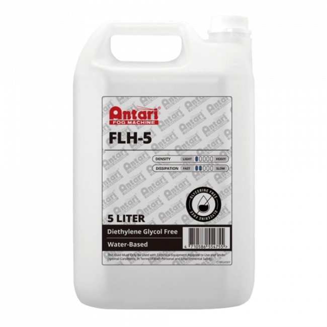 The Antari FLH-5 Fog Fluid is a water-based fog fluid that produces a very light density fog that is fast dissipating. FLH is particularly suitable for use with fan-type fog machines and is gentle on the vocal cords, making it ideal for bands, singers and actors. All ingredients used in Antari fluids are harmless and not classified under the CLP regulations.