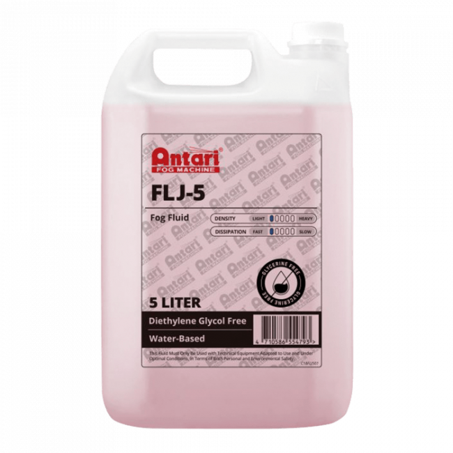 The Antari FLJ-5 Fog Fluid is a water-based fog fluid that produces a very light fog that is very fast dissipating. It can be used as a replacement for Antari FLR. The fog is visually dense, but dissipates quickly in the air. All ingredients used in Antari fluids are harmless and not classified under the CLP regulations.