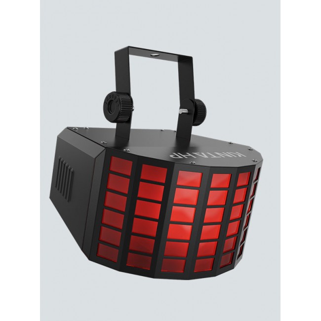 Dazzling displays of thousands of multi-colored beams burst from this compact high-powered LED effect light. Kinta HP features an innovative grouping of 2 quad-color LEDs (RGBW & CMYO) to produce unique color combinations and continuous motor rotation produces dynamic effects not capable on other fixtures. Kinta HP has adjustable motor speed and rotation to ensure the light matches the environment and its digital display allows color and rotation speed control without the need of DMX. Trigger built-in automated and sound-activated programs in master/slave or DMX mode and use an optional IRC remote for more flexible control options.