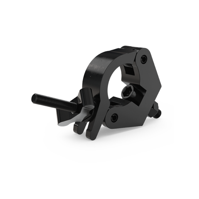 Black anodized narrow clamp with threaded M12 bolt. 1,650 lb (750 kg) load capacity. Fits 2 inch (50 mm) truss.